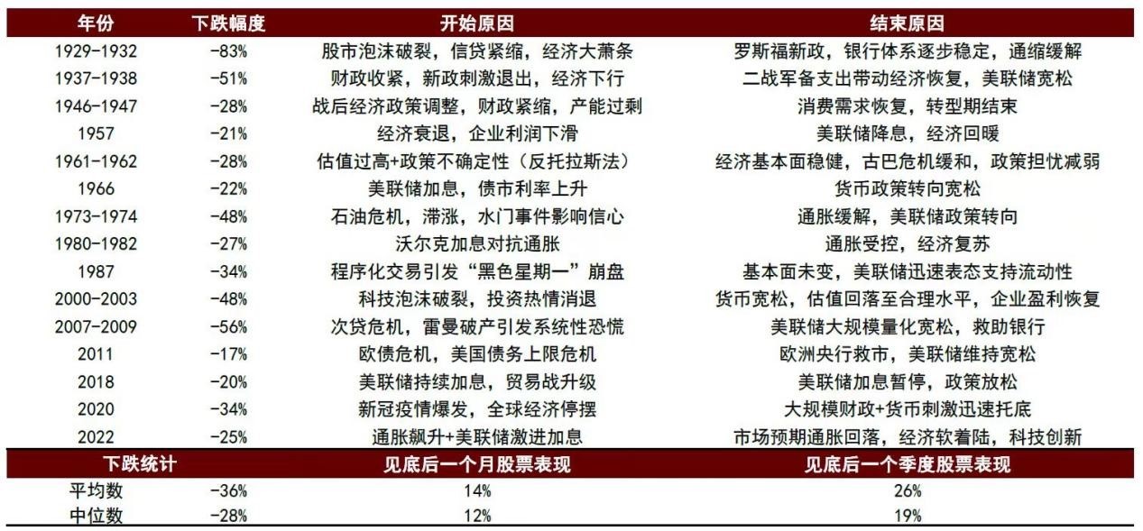 目前标普 500 下跌接近 20%,纳斯达克下跌超过 20%,从历史经验看,美股下跌 20% 后,往往会有技术性反弹机会,但市场拐点常常发生在政策明显转向之后,即降息和减税政策落地之后。