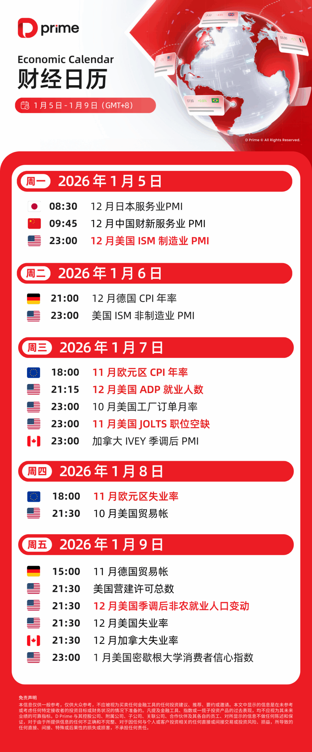 财经日历 | 以下为 2025 年 1 月 5 日至 2025 年 1 月 9 日(GMT+8 北京时间) 全球重大经济事件提醒。在重大行情期间,请确保您已审查您的保证金率,并有足够的保证金来支撑您的风险敞口。
