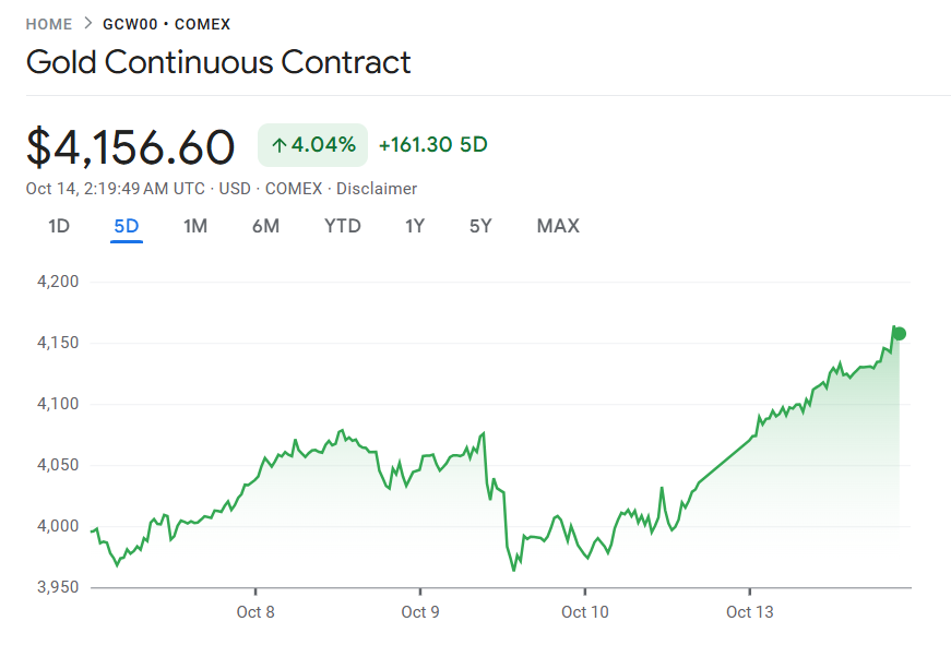 10 月 13 日至 14 日,受中美贸易关系再度紧张以及市场预期美国将进一步降息影响,资金持续涌入贵金属市场,金价首次突破每盎司 4100 美元大关再创历史新高,银价同步刷新纪录。
