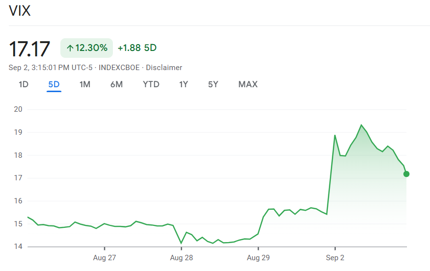 9 月 3 日,市场避险情绪明显升温。衡量美股投资者恐慌程度的 VIX 波动指数 一度飙升 26.2%,触及 19.38,为近期罕见大幅波动。
