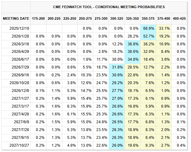 根据芝商所(CME)FedWatch 工具,交易员目前认为美联储在 12 月会议上降息 25 个基点的概率为 66.9%,预期已成为黄金与贵金属上涨的重要支撑因素。