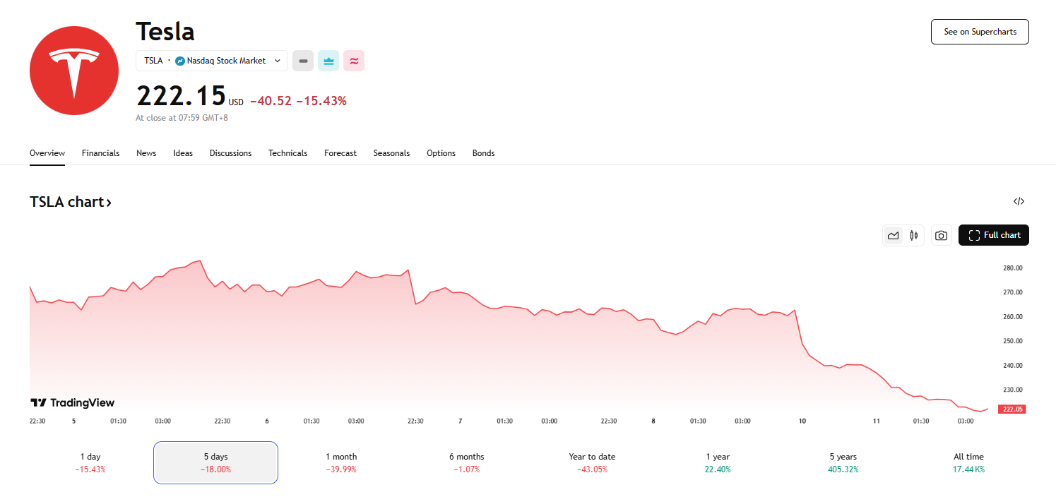 行业动态 | 特斯拉暴跌逾 15% 创七周连跌,美股重挫创今年最大单日跌幅