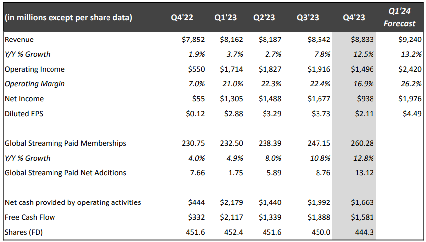流媒体巨头奈飞(Netflix)公布了其 2023 年第四季度财务业绩,其流媒体付费用户净新增数量创下新高,营收和对今年第一季度的每股收益指引超出市场预期,同时释放出今年将进一步涨价的信号。