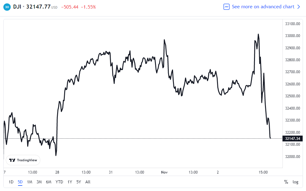 道指下跌 505.44 点,收于 32147.76 点,跌幅为 1.55%;标普 500 指数下跌 96.41 点,收于 3759.69 点,跌幅为 2.50%;纳指下跌 366.05 点,收于 10524.8 点,跌幅为 3.36%。