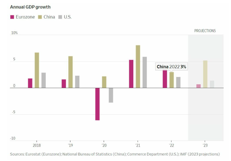 对于英国今年是否会陷入衰退,经济学家仍存在分歧。2022 年,欧盟 GDP 成长率意外超前达 3.5%,表现比中国的 3% 和美国的 2.1% 更好。国际货币基金组织( IMF )预测,2023 年中国将反超达 5.1%,美国 GDP 将成长 1.5%,欧盟仅 0.7%。相比之下,IMF 对 2023 年英国的 GDP 成长率是 -0.6%,落后于全球其他主要经济体,甚至饱受西方制裁的俄罗斯也预计将有 0.3% 的微幅增长。IMF 认为,英国仍旧高度依赖天然气,人民生活成本一直居高不下,而且英国的财政政策和货币紧缩成效不大,加上英国就业市场依旧冷淡,因此国家经济难以实现高增长。