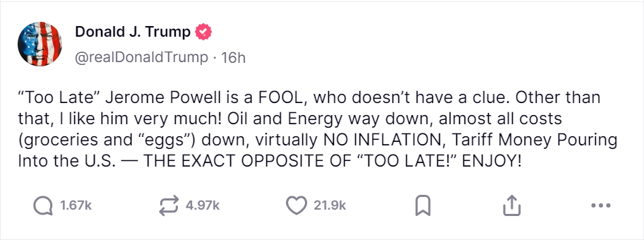 特朗普再次高喊 “去买股票”,讽刺 “太迟先生” 鲍威尔是个傻瓜