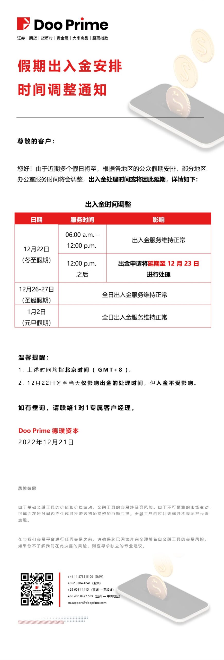 假期出入金安排时间调整通知