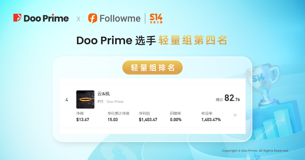 Doo Prime 的一众选手更在大赛中表现出色,其中 10 位 Doo Prime 交易员凭借卓越的交易技巧与稳定的投资表现,成功跻身 FOLLOWME S14 交易大赛总榜前五十名,充分展示了他们高超的交易水平以及强大的竞争力。