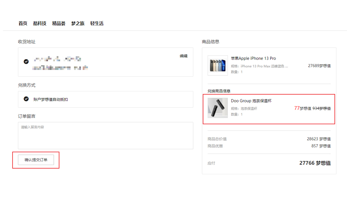 - 选择礼品规格及数量(单一订单必须满 700 梦想值),然后以77 梦想值的优惠价 ,兑换“Doo Group 限量版泡茶保温杯”