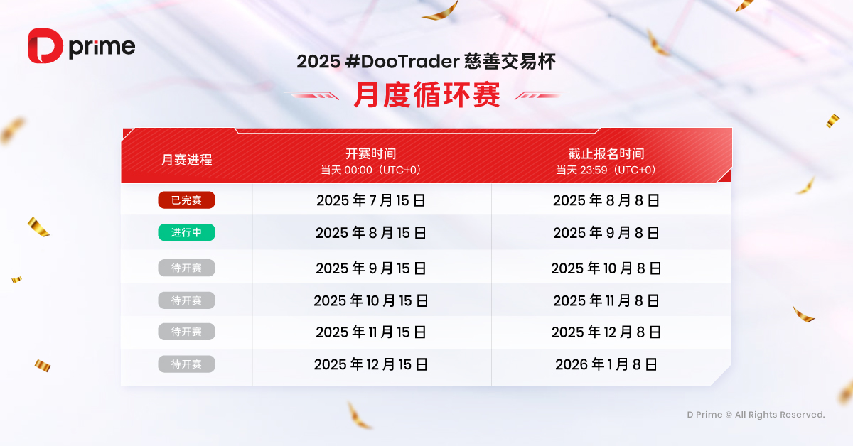 在 2025 #DooTrader 慈善交易杯首轮比赛收官之际,第二轮月赛也正式拉开帷幕!四大国际赛区正式同步开放,大赛面向全球交易者发出挑战邀约。现在加入,争夺丰厚奖金,赢得属于您的高光时刻 >>>>>>点击此处立即报名参赛