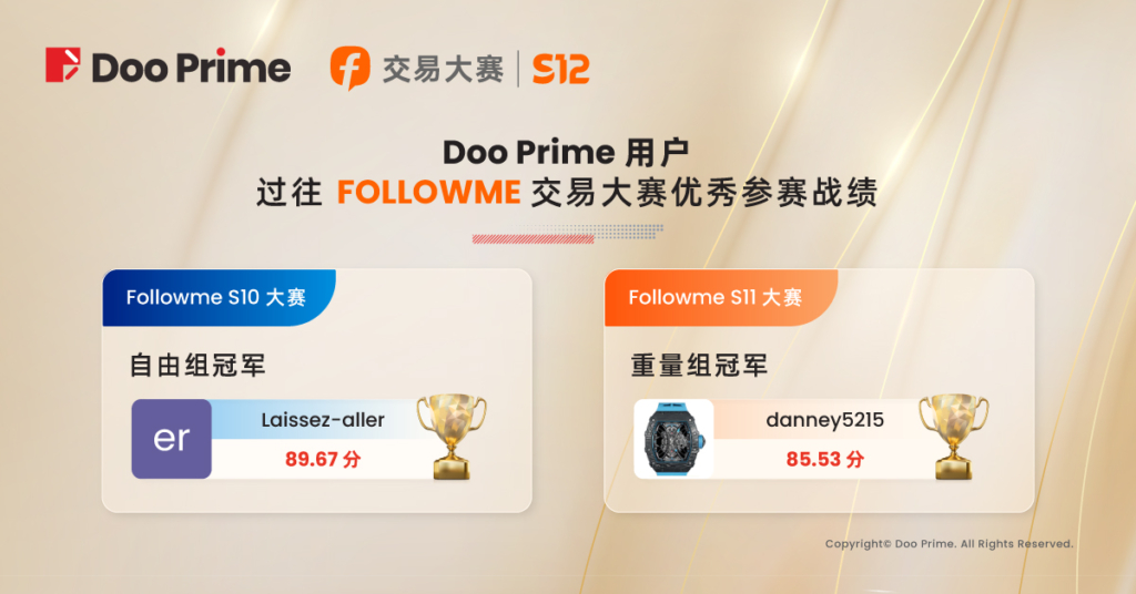 Doo Prime 再次作为 FOLLOWME 交易大赛的钻石赞助商,除了奖金与荣誉的吸引,也是平台及业内对 Doo Prime 的高度肯定。2023 年 Doo Prime 蓄势待发,始终将客户利益放在首位,力争为投资者提供良好的交易环境,严格遵守权威机构监管规范,保障客户资金财产安全;全面提供过万种交易产品,汇集 500 多位行业精英打造顶级团队,为客户提供全年 365 天不间断式专业服务;依托 Doo Prime 金融创新技术发展,实现极速交易,并以 0.1 pips 超低点差及 1:1000 优势杠杆,赋能投资者以低成本撬动大机会。Doo Prime 将以自身的全面优势,助推广大参赛客户,在 S12 交易大赛中再创佳绩。