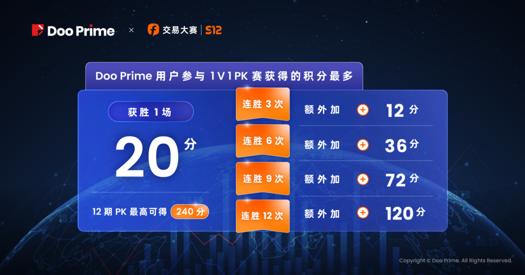 而此次 S12 交易大赛在 Doo Prime 的加持与助力下,将会为全球投资者提供更广阔、多元的发展空间与展示舞台,赋能金融创新与科技发展,共同期待各位选手在本届大赛中挑战自我,逐浪巅峰。
