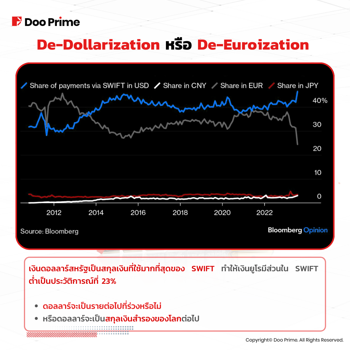 จากข้อมูลการชำระเงินระหว่างประเทศของ SWIFT เราจะเห็นได้ว่ายูโรถูดลดอำนาจในการชำระเงินทั่วโลกลง ซึ่งไม่ได้เกิดกับสกุลเงินดอลลาร์สหรัฐ