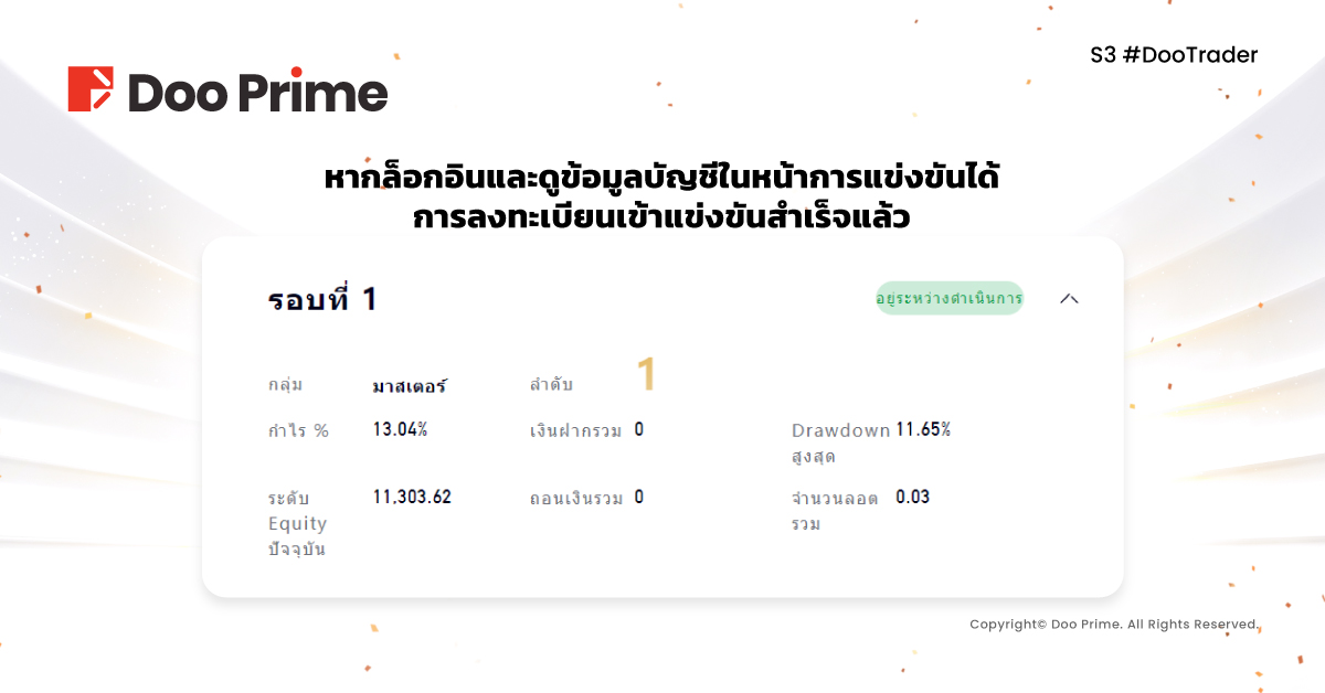 เมื่อคุณสามารถลงชื่อเข้าใช้ในหน้าการแข่งขันได้แล้ว หมายความว่าคุณได้เข้าร่วมการแข่งขันอย่างเป็นทางการ ผู้เข้าแข่งขันสามารถทำการซื้อขายได้อย่างอิสระเพื่อแข่งขันรับเงินรางวัล!