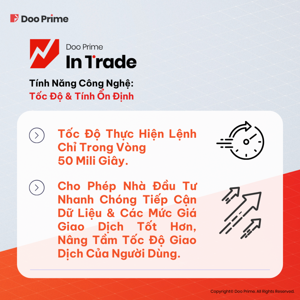 Doo Prime InTrade mang lại tốc độ thực hiện lệnh “thần tốc”, chỉ trong vòng 50 mili giây. Hiệu suất như trên giúp đảm bảo Doo Prime có thể xử lý hàng loạt các dữ liệu báo giá theo thời gian thực cùng lệnh của khách hàng trong khoảng thời gian ngắn nhất. Đây chính là chìa khoá mang đến cho quý khách hàng trải nghiệm giao dịch cực kỳ nhanh chóng và thuận tiện.