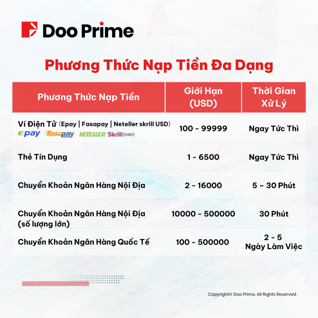 Doo Prime cũng vô cùng tự hào khi được hợp tác với các ngân hàng và nhà cung cấp dịch vụ thanh toán lớn tại Đông Nam Á, từ đó cung cấp cho khách hàng các tùy chọn nạp tiền một cách thuận tiện hơn. Bên cạnh đó, nhằm giúp trải nghiệm của quý khách hàng trở nên mượt mà hơn, Doo Prime còn chi trả các khoản phí phát sinh thông qua những giao dịch chuyển khoản tại các ngân hàng nội địa trên. Với Doo Prime – nhà môi giới cam kết bảo mật các giao dịch và mở rộng những phương thức tiếp cận nguồn quỹ, khách hàng có thể hoàn toàn tin tưởng nạp tiền để thực hiện các lệnh giao dịch liên quan.