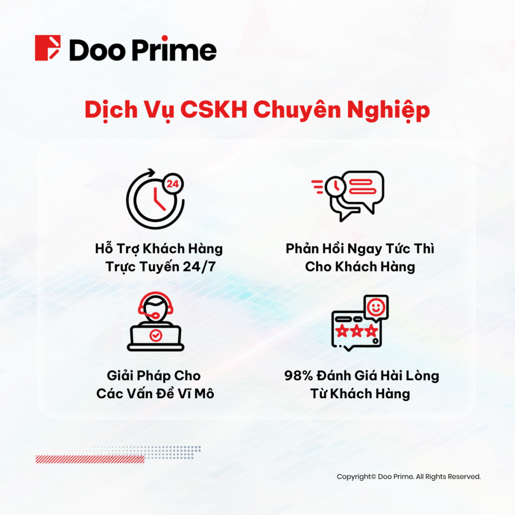 Bộ phận CSKH của Doo Prime luôn trực sẵn 24/7 nhằm cung cấp các giải đáp chuyên sâu về sản phẩm, dịch vụ bằng nhiều thứ tiếng khác nhau, trong đó có tiếng Anh, tiếng Trung, tiếng Hàn, tiếng Thái và tiếng Việt. Với nhiều kênh dịch vụ khách hàng như trò chuyện trực tuyến (live chat), điện thoại, email cùng người quản lý tài khoản cá nhân, chúng tôi cam kết cung cấp trải nghiệm liền mạch cho quý khách hàng. Điều này được thể hiện qua tỷ lệ hài lòng của khách hàng đối với chúng tôi (98%) vào cuối năm 2022. Đây rõ ràng là một minh chứng “sống” cho chất lượng của dịch vụ chăm sóc khách hàng của chúng tôi.