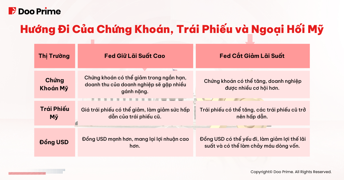 Nếu lãi suất Fed tiếp tục giữ mức cao, đà tăng của thị trường chứng khoán Mỹ yếu dần, trái phiếu sẽ có thể giảm, và đồng Đô la Mỹ sẽ càng mạnh. Ngược lại, nếu Fed làm theo xu hướng chung để cắt giảm lãi suất, chứng khóa Mỹ có thể tăng tiếp, trái phiếu cũng sẽ có đà tăng, nhưng USD sẽ bắt đầu giảm.