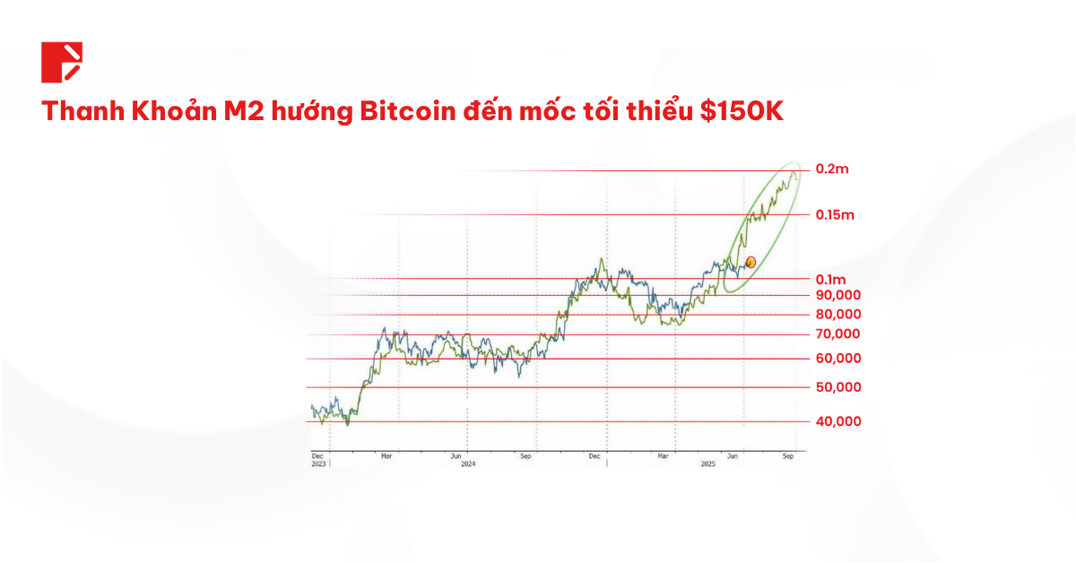 Biểu đồ M2 lúc này đang diễn biến giống như chỉ báo dẫn dắt 12 tuần cho giá Bitcoin. Khi đường M2 di chuyển lên trên, Bitcoin thường nối gót đi theo sau. Hiện tại, tín hiệu M2 cho thấy khả năng Bitcoin có thể hướng tới mốc tối thiểu là $150,000. Hơn nữa, với việc được theo dõi sát sao thì cộng đồng giao dịch, thì Bitcoin còn có thể được thúc đẩy để tăng cao hơn nữa.