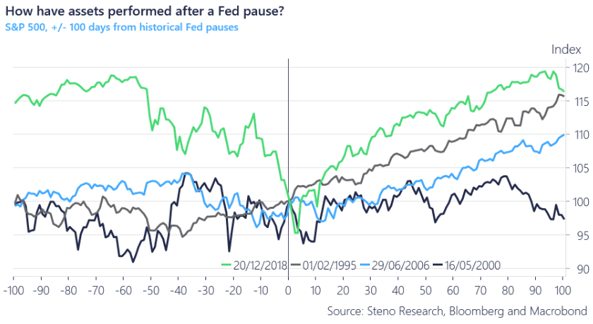 Nhìn vào lịch sự những lần đều chỉnh chính sách tiền tệ của Fed, việc ngừng tăng lãi suất sẽ tạo hiệu ứng tích cực cho thị trường chứng khoán Mỹ, trong khi việc tăng lãi sẽ dẫn đến lợi suất trái phiếu cao hơn và đồng đô la mạnh hơn. “Hawkish pause” sẽ ảnh hưởng thế nào đến thị trường cổ phiếu, trái phiếu và tiền tệ?